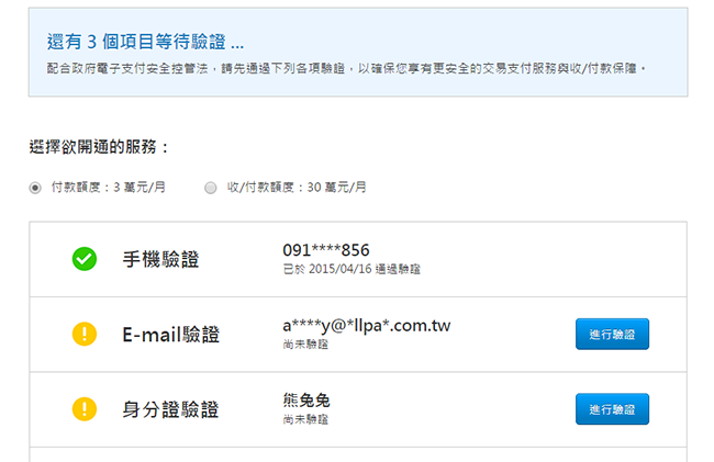 選擇欲開通的服務後,依照畫面指示驗證完所有驗證項目,即完成會員註冊。