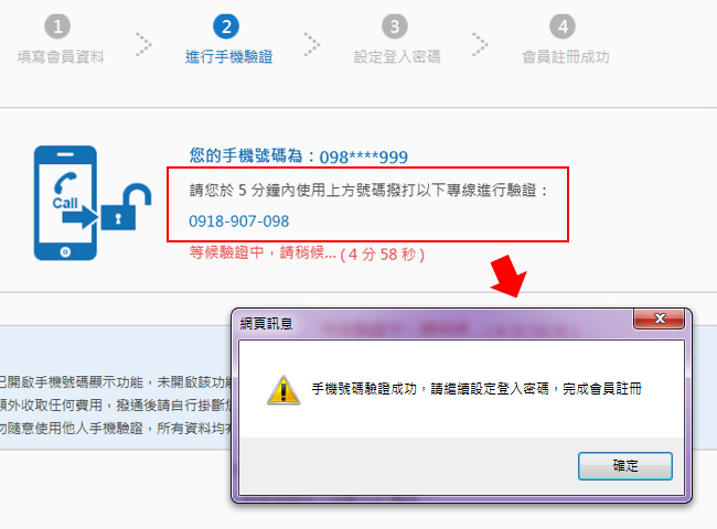 若未收到簡訊驗證碼,可透過手機直撥專線進行驗證,請於5分鐘內撥打完成。