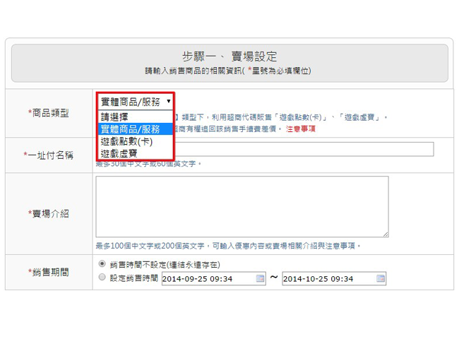 • 設定商品類型、一址付名稱、賣場介紹與銷售時間等相關資料。(一址付名稱僅供管理使用,會顯示在【一址付-連結管理】>【一址付名稱】欄位中)。